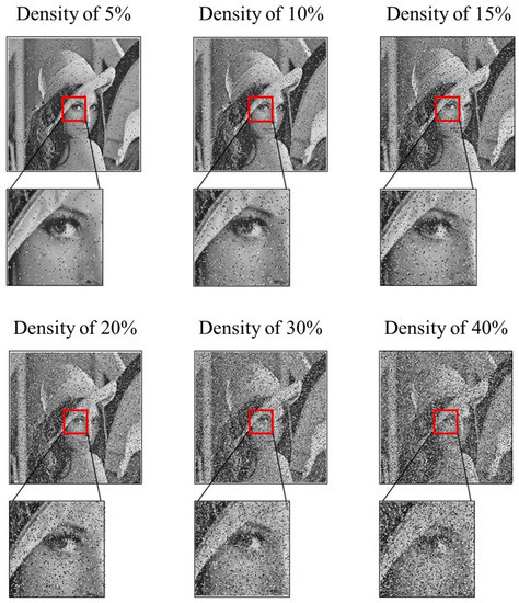 This experiment was carried out on the MATLAB platform, and the added noise was random impulse noise. The low-density noise experiment selected 5%, 10%, and 15% noise, and the medium-density noise experiment selected 20%, 30%, and 40% noise.