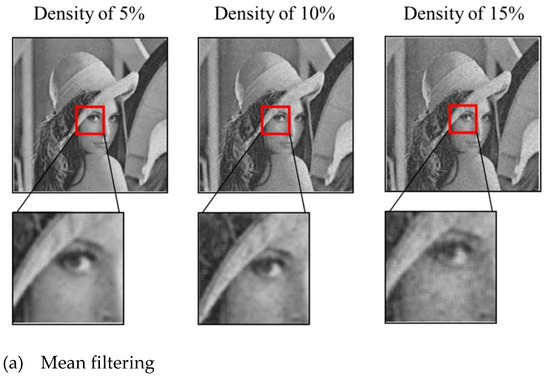 In this experiment, a simple mean filtering window of 3 × 3 was adopted for mean filtering. From the overall effect, the image is blurred, although there is no obvious noise trace. However, many of the effective details of the image are suppressed and smoothed and, due to the influence of noise on the mean value, the image after denoising still has many small gray jumps. The shadow of noise can still be seen in the image. This phenomenon becomes serious with increases in noise density, resulting in serious image distortion.