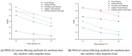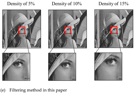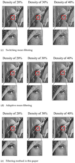 When random value impulse noise density is greater than 15% and less than 50%, it is denoted as medium-density random value impulse noise. Noise densities of 20%, 30%, and 40% were taken as the experimental object. The filtering effect of each filtering method is shown in Figure 16.