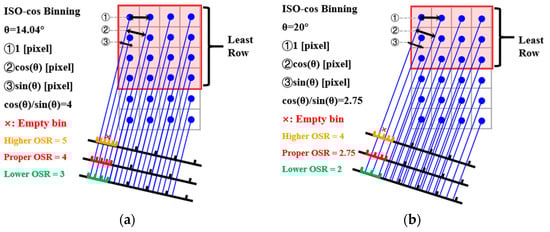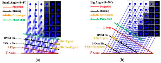 Diagrams of projection and binning in edge method (OSR = 4): (a) when the edge angle is small (θ = 8 deg), (b) when the edge angle is big (θ = 30 deg).