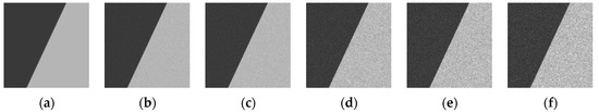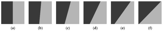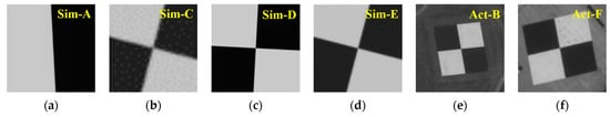 Geospatial quality reference dataset provided by CEOS/WGCV/IVOS: (a) Simulated edge image A (200 pix·200 pix), (b) Simulated edge image C (50 pix·50 pix), (c) Simulated edge image D (200 pix·200 pix), (d) Simulated edge image E (160 pix·160 pix), (e) Actual edge image B (320 pix·311 pix), (f) Actual edge image F (204 pix·162 pix).