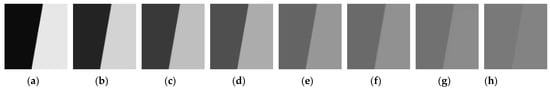 Blurry degraded edge with different contrasts (BDE@Con): Based on the BDE image, eight kinds of BDE@Con edge images (0.04, 0.10, 0.15, 0.20, 0.36, 0.52, 0.68, 0.84) were obtained by adjusting the gray values of the bright (B) and dark (D) edges (B130/D120, B138/D112, B144/D106, B150/D100, B170/D80, B190/D60, B210/D40, B230/D20). The simulated partial BDE@Con images with different contrasts are shown in Figure 3.