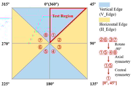 If the absolutely vertical upward edge is taken as the reference of 0 deg and the clockwise is positive, the angle range of all possible edges is [0, 360] deg, which can be divided into the vertical edge (θ∈ [−45, 45] ∪ [135, 225] deg) and horizontal edge (θ∈ [45, 135] ∪ [225, 315] deg). According to the axisymmetric and centrosymmetric properties of edge features, and referring to the angle transformation equation of reference [7], [0, 360] deg edges can be correspondingly transformed into [0, 45] deg vertical edges for analysis. The angle transformation diagram is shown in Figure 5. In this section, four representative edge methods are used to measure the MTF of BDE images with different edge angles of 0~45 deg. The simulation results are expressed in Cartesian coordinates and polar coordinates, as shown in Figure 6.