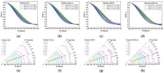 MTF for different tilt angle edge images vary from 0.20 deg to 44.5 deg (the angle interval is 0.50 deg) in Cartesian and polar coordinates using different modified edge methods: (a–d) ISO, ISO-cos, OMNI, OMNI-sin edge method in Cartesian coordinates, (e–h) ISO, ISO-cos, OMNI, OMNI-sin edge method in polar coordinates.