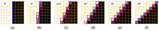 Figure 6e–h verify the effectiveness of measuring MTF in different directions with different angle edges. However, the simulation results show that when the edge images with the same blurry effect and different angles are used, the MTF results are different in various directions, which may be directly related to the rectangular grid structure of digital image detectors or displays. The physical structure leads to different sampling degradation in different directions. The blurry degradation effect of simulated edge images with different angles is consistent, but the sampling degradation effect is different, so the actual MTF curves are scattered with the change of edge angles. The schematic diagrams of degradation caused by a digital sampling of edge images from different angles are shown in Figure 7. In particular, the conclusion is reasonable speculation, and it is necessary and valuable to further study and verify.