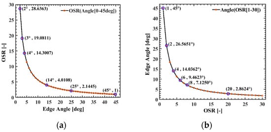 Theoretical relationship between OSR and edge angle: (a) OSR when angle belong to [0, 45] deg and some OSR labels at integral angle, (b) angle when OSR belong to [1, 30] and some angle labels at integral OSR.