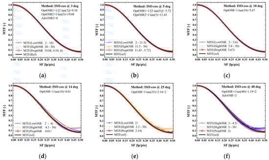 MTF for some tilt angle BDE images when adopting different OSR (ideal optimal, ideal suboptimal, advised, proper, high, and low OSR) using ISO-cos edge method: (a) when edge angle is 3 deg, (b) when edge angle is 5 deg, (c) when edge angle is 10 deg, (d) when edge angle is 14 deg, (e) when edge angle is 25 deg, (f) when edge angle is 40 deg.