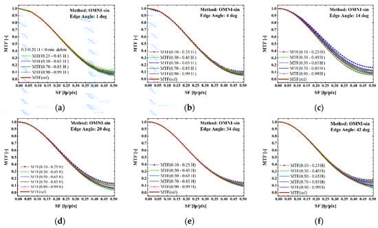 MTF for some tilt angle BDE images when adopt different ROI-H (0.10~0.99) using OMNI-sin edge method: (a) when edge angle is 1 deg, (b) when edge angle is 4 deg, (c) when edge angle is 14 deg, (d) when edge angle is 20 deg, (e) when edge angle is 34 deg, (f) when edge angle is 42 deg.