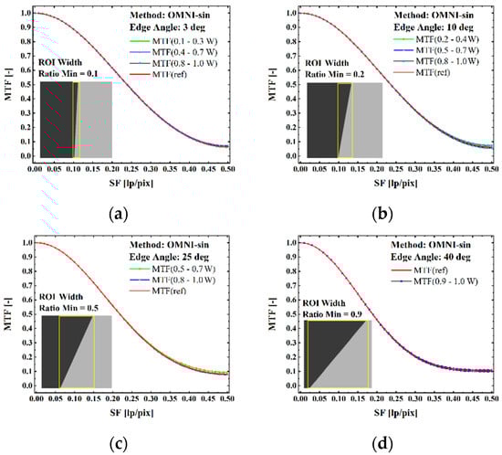 MTF for some tilt angle BDE images when adopt different ROI width using OMNI-sin edge method: (a) when edge angle is 3 deg, (b) when edge angle is 10 deg, (c) when edge angle is 25 deg, (d) when edge angle is 40 deg.