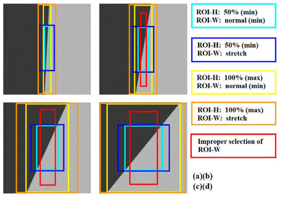 Graphic diagram of ROI extraction at minimum/maximum ROI-H and normal/stretched/improper ROI-W: (a) when edge angle is 3 deg, (b) when edge angle is 10 deg, (c) when edge angle is 25 deg, (d) when edge angle is 40 deg.