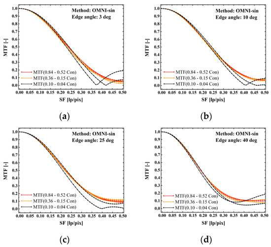 MTF for some tilt angle BDE@Con images when adopt different edge contrast using OMNI-sin edge method: (a) when edge angle is 3 deg, (b) when edge angle is 10 deg, (c) when edge angle is 25 deg, (d) when edge angle is 40 deg.