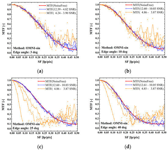 In this section, Gaussian, gamma, uniform, and speckle noise, which are four typical noises, are mixed and added into ideal edge images as noise simulation sources in RS images. Different noise levels are controlled by modifying the variance and mean of noise. Moreover, the parameters of added noise are shown in Table 2. The BNDE images with four angles of 3, 10, 25, and 40 deg, 400 × 400 pixels, and 300 dpi are determined for analysis, and the SNR of edge images is controlled to be 3.9~12.6 dB by adjusting different noise parameters. The OMNI-sin edge method is used to measure the MTF of edge images with different angles and different SNRs in Figure 4, and the simulation results are shown in Figure 15.