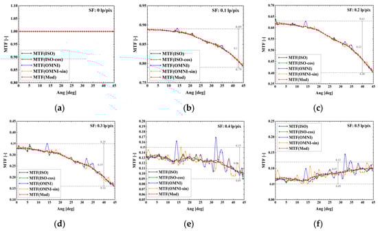 Figure 6a–h show that the consistency of MTF curves obtained by [0.2, 14.5] deg edges is obviously higher than that of other angle interval edges in the whole frequency ranges. This conclusion is basically consistent with the view that accurate MTF measurement results can be obtained by [2,10] degree edge verified in literature [23]. It shows that MTF measurement with STA edges has high stability. When the edge angle is greater than 15 deg, the MTF curves appear a downward trend with the increase of edge angle in the middle and low frequency ranges (Roughly [0, 0.42] lp/pix). It can be clearly seen that the larger the angle is, the more obvious the MTF downward trend is. When the edge angle is greater than 30 deg, the MTF curves appear an upward trend with the increase of edge angle and tend to be aliased in the high frequency ranges (roughly [0.42, 0.50] lp/pix). The above simulation results further confirm the validity and rationality of ISO 12233′s recommendation of determining STA edges to measure MTF in horizontal or vertical directions approximately.