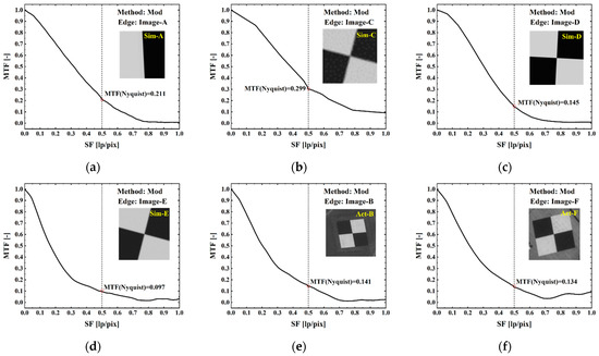MTF measurements of Geo spatial quality reference dataset by Mod edge method: (a) Simulated edge image A, (b) Simulated edge image C, (c) Simulated edge image D, (d) Simulated edge image E, (e) Actual edge image B, (f) Actual edge image F.