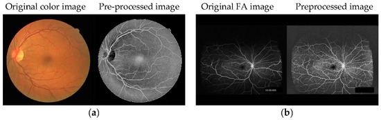 For U-Net training, 40 RGB color retinal images from color photographs of the Digital Retinal Images for Vessel Extraction (DRIVE) database [17] and 20 images from the Structured Analysis of the Retina (STARE) database [18] were used as training data for learning how to use the U-Net network. Each database includes manual vessel segmentation images by experts. The resolution of DRIVE images is 565 × 584 pixels and STARE images are 700 × 605 pixels. The resolution of FA images is 2500–4000 × 2500–4000 pixels; thus, the input size of U-Net was unified at 1024 × 1024 pixels. The training images were converted to 1024 × 1024 pixels by zero-padding of peripheral pixels. The fundus region of the training images was not enlarged to prevent the vascular width increasing. On the other hand, test images were reduced to 1024 × 1024 pixels, and their vascular width was also narrow. In order for the FA images to resemble RGB color images, as shown in Figure 1a, RGB images were pre-processed as follows. Grayscale images were generated after reading the RGB color fundus images. To improve limb darkening of the fundus image, contrast limited adaptive histogram equalization (CLAHE), as a histogram flattening method, was used for enhancement of the contrast in local areas of the fundus images. After that, gamma correction was used to adjust the intensity values, and negative-positive inversion was performed. U-Net was trained using these 60 pre-processed RGB color retinal images without FA images.