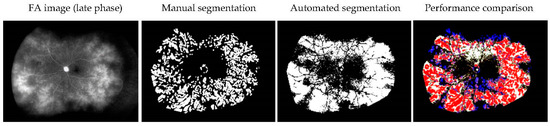 Comparison of manual and automated segmentation of the retinal vascular leakage area in a representative case (idiopathic uveitis). True positive: red. False negative: blue. False positive: white.