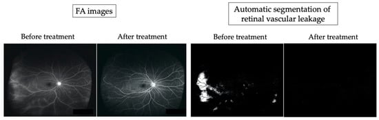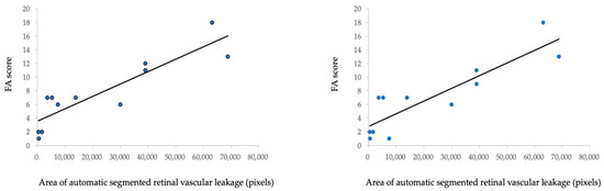 To analyze the correlation between the automated retinal vascular leakage area and FA score in six patients before and after treatment, we evaluated the FA score according to the FA scoring system demonstrated in a previous study [7]. Figure 4a shows a statistically significant positive correlation between the automated segmented area (pixels) of the retinal vascular leakage area and the total FA score (Spearman’s correlation coefficient = 0.890, p < 0.001). Furthermore, Figure 4b shows a significant positive correlation between the automated segmented area (pixels) of the retinal vascular leakage area and FA vascular leakage score (Spearman’s correlation coefficient = 0.880, p < 0.001). Fluorescein angiography images and automatic segmentation of retinal vascular leakage of a representative case before and after initiation of IFX is shown in Figure 5.