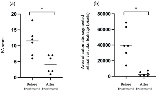 We compared the pixels of automatic segmented vascular leakage in FA images before and after treatment. As shown in Figure 6a, we compared the FA score from six patients before treatment and after treatment, and the mean FA score after treatment was significantly reduced compared with that before treatment. Similarly, as shown in Figure 6b, the mean pixels of automatic segmented vascular leakage with treatment was significantly reduced compared with that before treatment. These findings suggested that measurement of pixels for automatic segmented vascular leakage may be useful for objective assessment of vascular leakage before and after treatment in eyes with posterior uveitis.