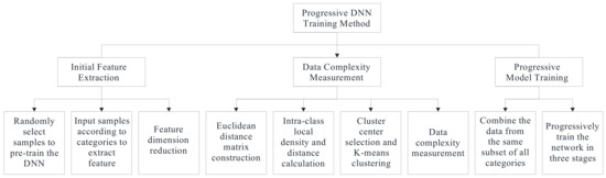 An overview of the proposed method is given in Figure 1. It mainly contains three steps: (1) initial feature extraction, (2) data complexity measurement, and (3) progressive model training. First, random samples from the sample dataset are chosen to pretrain the DNN, and all samples are fed into the trained model according to their categories for feature extraction. Second, the K-means algorithm is employed to divide the samples in each category into three clusters according to the product of the local density and distance; then samples in each category are divided into easy-to-classify, relatively easy-to-classify, and hard-to-classify subsets according to the smallest intra-class local density in each cluster. Third, data from the same subset of all categories are combined, and the data are fed into the DNN in order from easy to hard to progressively train the DNN in three stages. Thus, the model capacity can be gradually improved gradually by progressively adding increasingly complex data into the training process.