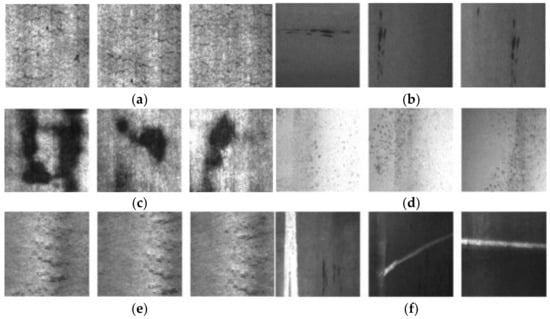 Examples of defect images in NEU: (a) crazing (Cr), (b) inclusion (In), (c) patches (Pa), (d) pitted surface (PS), (e) rolled-in scale (RS), and (f) scratches (Sc).