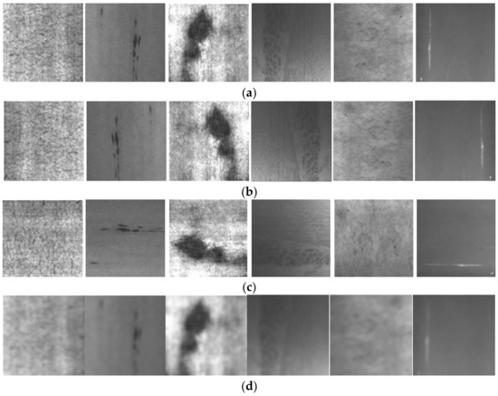 In the surface-defects dataset of Northeast University (NEU) [31], six typical surface defects of hot-rolling steel strip were collected: crazing (Cr), inclusion (In), patches (Pa), pitted surface (PS), rolled-in scale (RS), and scratches (Sc). Each defect contained 300 labeled grayscale images with an original resolution of . Figure 2 shows examples of the defective images in NEU. The defects in the same columns belong to the intra-class defects, and the different columns belong to the inter-class defects. In the figure, it is clear that the inter-class divergence is small, but the intra-class divergence varies. However, the appearance of inter-class defects can be different; for example, the scratches may be horizontal, vertical, or slanting. Moreover, intra-class defects may also have similar aspects, such as the rolled-in scale, crazing, and pitted surfaces. In addition, due to the influence of illumination and material changes, the grayscale of the intra-class defect images varies.