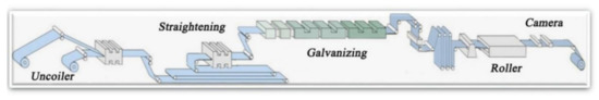 The proposed method was applied to solve a real-world steel-surface defects-detection case. We assessed a Chinese real-world cold-rolling steel workshop which produces elector-galvanized steel strips for vehicles. The flowchart of the production is shown in Figure 8. Statistically, the qualified rate of this production is only 78.6%, and more than 95.4% of defects occur on the surface. An automatic surface inspection (ASI) system was set up, and defect images were collected. In the early stages, the workshop had already carried out some degree of intelligent defect detection. Support vector machine (SVM) algorithms were applied to classify the defects, but the recognition accuracy was less than 70%, and at least 85% was required in this workshop.