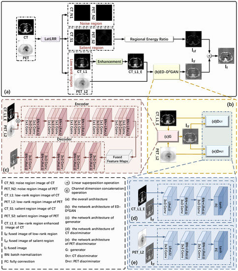 Based on the above problems, in order to better preserve the anatomical structure and contour intensity information of the CT source images, the functional and metabolic information of the lesion area in the PET source images are highlighted, and to enhance the visibility of the source images, a hybrid multimodal medical image fusion method (LatLRR-GAN) based on LatLRR and dual discriminators GAN (ED-D2GAN) is proposed by combining LatLRR and GAN in this paper. Considering the denoising ability of LatLRR, in order to reduce the impact of noise in the fusion process, this paper firstly uses LatLRR to decompose the source images. Secondly, we show how GAN has the following advantages: (1) Strong feature extraction ability; (2) an end-to-end image fusion process; and (3) how the quality of fused images can constantly adjust through the adversarial game between generator and discriminator. This paper introduces GAN into the framework of multimodal medical image fusion tasks based on decomposition transformation to alleviate the shortage of manual design of complex fusion rules and improve the quality of the fused images. Additionally, considering the shortcomings of using a single discriminator, this paper uses dual discriminators to fully obtain the valid information contained in the source images and highlight the lesion information in the fused images. Finally, due to how the fusion rule based on region energy can obtain local region feature information and improve the sharpness of the fused images, this paper uses the threshold adaptive weighting algorithm based on a region energy ratio as the salient region fusion rule.