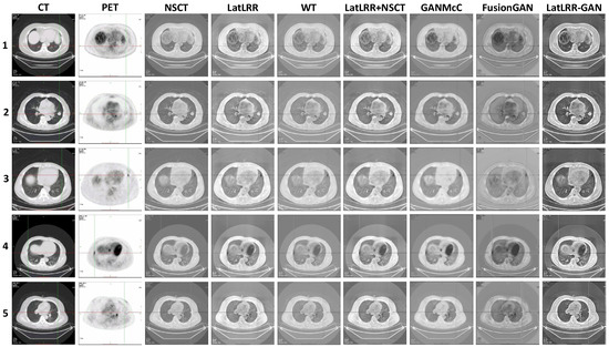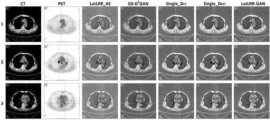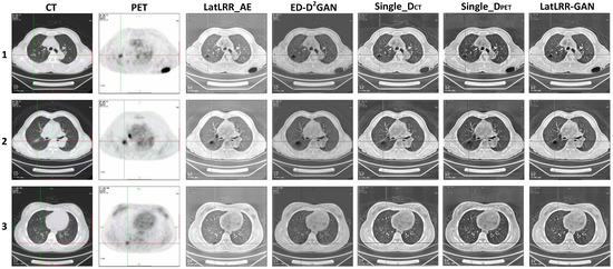 Three cases of CT lung window images and PET images and three cases of CT mediastinal window images and PET images were selected, respectively, for ablation experiments to verify the effectiveness of the proposed method. Method 1 (LatLRR_AE): LatLRR was used to decompose the source images, the average value fusion rule was used for the low-rank region images, and the threshold adaptive weighted fusion rule based on the region energy ratio was used for the salient region images, which verified the effectiveness of the ED-D2GAN low-rank region images’ fusion rule proposed in this paper. Method 2 (ED-D2GAN): The ED-D2GAN proposed in this paper was directly used to fuse the source images, and the effectiveness of the LatLRR decomposition of the source images was verified. In addition, the advantages of ED-D2GAN using two discriminators were verified by changing the number of discriminators. Method 3 (Single_DCT): only the DCT discriminator was used and the remaining parts were consistent with the proposed method. Method 4 (Single_DPET): only the DPET discriminator is used and the remaining parts were consistent with the proposed method. Method 5 (LatLRR-GAN): LatLRR was used to decompose the source images, ED-D2GAN based fusion rule was used for the low-rank region images after decomposition, and the threshold adaptive weighted fusion rule based on a region energy ratio was used for the salient region images after decomposition.