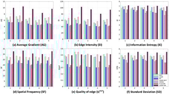 The fusion results of CT mediastinal window images and PET images are shown in Figure 5 and the evaluation metric results of the fused images are shown in Table 2. The best evaluation metric values are represented in red; the second-best evaluation metric values are represented in blue. Bar charts of the evaluation metric values of the fused images are shown in Figure 6.