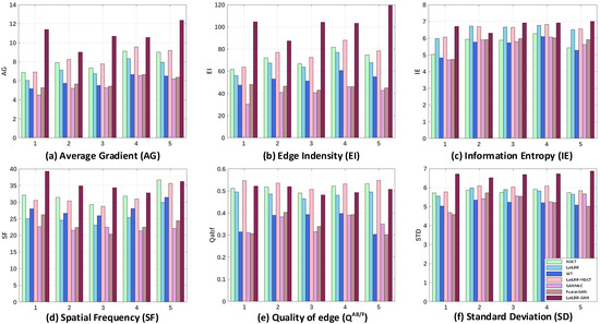 Six common evaluation metrics in the field of image fusion were used in the experiments to quantitatively evaluate the performance of LatLRR-GAN and other comparison methods. There was the average gradient (AG) [25], edge intensity (EI) [26], information entropy (IE) [27], spatial frequency (SF) [28], QAB/F [29] and standard deviation (SD) [30]. Among them, AG was used to measure the sharpness and texture details of the fused images. EI is a computational measure of image edge intensity, which is essentially the magnitude of the gradient of edge points. IE reflects the information content of the images and measures the expected value of the appearance of pixels at each position in the images. SF reflects the overall image sharpness and the change rate of the gray image. SF was obtained by row frequency and column frequency, and source images were not used as a reference image in the calculation. QAB/F was used to evaluate the amount of edge information transferred from input images to the fused image. SD measured the information richness of the fused images. Each evaluation metric was positively correlated with the quality of the fused images. The higher the evaluation metric value, the more details of the fused images could be obtained, and the higher the image clarity grade.