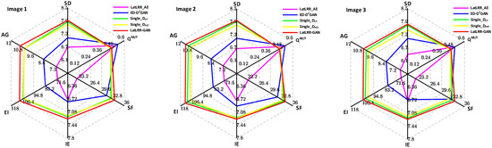 In summary, it can be seen from Figure 3, Figure 4, Figure 5, Figure 6, Figure 7, Figure 8, Figure 9 and Figure 10 that the visual effect of the fused images obtained by the method LatLRR-GAN proposed in this paper is superior to other fusion methods, which proves the superiority of LatLRR-GAN. Similarly, it can be seen from the objective evaluation metric values in Table 1, Table 2, Table 3 and Table 4, which can be quantitatively compared, that the LatLRR-GAN has certain advantages in AG, EI, IE, SF and SD.