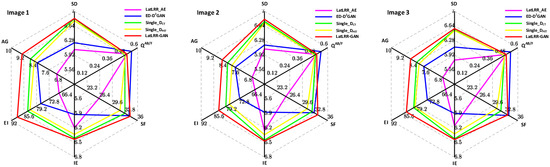 As can be seen from the evaluation metrics of IE and SD in Table 1 and Figure 4, there is little difference between the evaluation metric values of the Methods 4 and 7, which reflects how the fused images’ sharpness of these two methods is better. From the evaluation metrics of AG, EI and SF in Table 1 and Figure 4, it can be seen that Method 7 had a great improvement compared with other methods, which reflects the strong ability of the proposed method in preserving detailed information, such as that of the lung bronchus and edge intensity. Therefore, fused images with high definition and rich details could be obtained by the LatLRR-GAN method proposed in this paper.