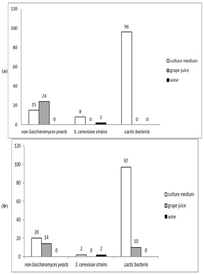 Inhibitions representative of all the possible typologies of antagonisms have been observed, including all tested microbial categories (i.e., Saccharomyces/non-Saccharomyces yeasts and lactic acid bacteria). According to the extent of their antagonistic behaviors, the different microorganisms used in this study have been classified as strains of mild (±), middle (+), or strong (++) inhibitory activity showing halos of inhibition, surrounding the respective spots, with a diameter lower than 3 mm, ranging from 3–6 mm or more than 6 mm, respectively. Evidence has been detected in all three media agar used as substrates, resulting in a more frequent on culture medium, followed by grape juice and, finally, wine. In particular, referring to the exerted (Figure 1a) and suffered (Figure 1b) inhibitions, non-Saccharomyces yeasts and LAB showed activity on culture medium and grape juice while S. cerevisiae strains on culture medium and—in only a few cases—wine. These results confirmed, in the oenological field, that in vitro antagonisms do not necessarily correlate with the same behavior in in situ studies [57]. Highlighted trends indicate a selective maintenance of the antagonistic character shifting from tests on a culture medium to evaluation on the edible matrix. Intriguingly, in the case of the yeasts, this selectivity seemed to correspond to the phase of dominance during winemaking: grape juice for non-Saccharomyces and wine for S. cerevisiae [58,59].