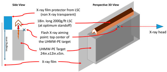 Because UHMW is transparent under the flash X-ray and the copper jets are not, the use of UHMW as a target material will reveal the penetration history during the jet-on-target. In order to improve the image quality and to prevent technical difficulties, multiple LSC shots with different exposure times were used to reveal the penetration time history in the target. It was assumed that the same sized LSCs would provide identical penetration or jet projection patterns. Previous field tests have shown that LSC detonation has quite reasonable consistency between shots (as long as the size of the LSC is identical), and this approach was determined to be reasonable.