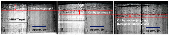 Close observation of the images indicates that the interface between the jet (black dots and lines) and UHMW target (grey area) shows two distinct slope angles, depending on the speed of penetration, slow or fast (red-dotted slope lines in Figure 3). The fast cutting occurred in the very early stage of penetration (mainly Jet Group A), and the slow cutting occurred in the later stage (tail of Jet Group A, but principally Jet Group B, top and middle figures in Figure 3). Note that the slope lines indicate the speed of penetration, since the detonation front moved from left to right. In other words, the time history of the penetration is shown in a single X-ray image, from left to right. The disappearance of jet segments indicates the consumption of jet segments during penetration. By pinpointing the location of the jet segments’ disappearance, the penetration depth of each jet group can be identified. Near the end of effective penetration by Jet Groups A and B, a large slug is moving into the target (a large black line in the upper part of the bottom figure in Figure 3), but the large slug does not contribute to the effective penetration and is not addressed here.