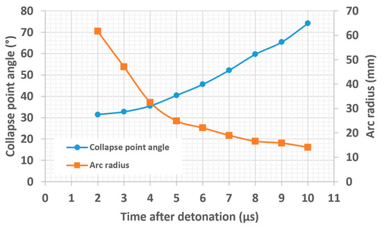According to the arc-deformed liner collapse theory, upon detonation, the two sides of the flat liner start moving toward each other to collapse. Due to the strong release of detonation gas along the edges of the liner, the edge of the liner moves slower than the center of the liner, and this causes an arc deformation [12,13,14]. This gradual arc deformation, followed by the collapse of the two arc-deformed liner sides, the collapse- point angle varies in a unique trend (Figure 5).