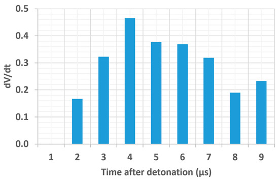 Figure 6 shows a sudden change of the liner arc radius at around 4~5 µs after detonation. The arc radius decreased at a higher rate until 4~5 µs after detonation, mainly driven by the strong detonation energy right next to the flat liner. This high rate of arc deformation in the early stage of detonation has been studied previously [13], and a very similar trend was seen. After this initial high rate of arc deformation, the arc deformation slowed, as the detonation gas behind the liner lost expansion energy. The arc deformation, the change of radius, after 5~6 µs became very slow. This clearly indicates that the effect of the detonation gas behind the liner weakened as the liner moved away.