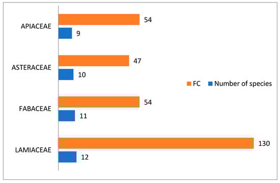After taxonomic identification, we were able to document a total of 135 ethnomedicinal species, belonging to 125 genera and 64 families administered in about 722 herbal preparations for the treatment of 23 disease categories. LAMIACEAE was the leading family with 12 species, followed by FABACEAE (11 species), ASTERACEAE (10 species), APIACEAE (9 species), ZINGIBERACEAE (6 species), SOLANACEAE, ROSACEAE (5 species each) and the remaining ones were represented by less than four species (Table 3 and Figure 1). Our findings regarding the predominance utilization of family LAMIACEAE, FABACEAE, ASTERACEAE, and APIACEAE in Eastern Morocco were in agreement with other regions of Morocco and constitute the main groups of medicinal flora in most other Mediterranean countries [7,8,9,10].