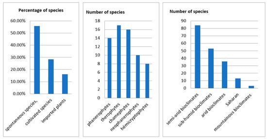 The result of life form analysis showed that therophytes (TH: annual, biennal or perennial herbaceous) constituted the highest proportion (17 species or 23.6%) of the identified species, followed by chamephytes (CH: shrubs) (16 species or 22.3%), phanerophytes (PH: trees and shrubs) (14 species or 19.5%), neophanerophytes (nPH) (10 species or 13.9%) and hemicryptophytes (annual, biennal or perennial herbaceous) (8 species or 11.2%). This finding is consistent with other studies [13] (Table A1). Generally, 44.7% of the medicinal species recorded in eastern Morocco (59 plants) flower during the spring, (46 plants) or 34.8% flower in summer, followed by 12.1% (16 plants) in winter and 6.8% (9 plants) in autumn. As for bioclimatic types, the listed plants belong to six bioclimatic: saharan, semi-arid, arid, humid, sub-humid, and high mountains. However, we note a dominance of medicinal species belonging to semi-arid bioclimates coming in at 38.2% (84 plants) (Semi-Arid mild: 53 plants or 24.1%, semi-arid cold: 28 plants or 12.7% and semi-arid: 3 plants or 1.4%), (53 plants) or 24.1% belong to sub-humid bioclimates followed by (36 plants) or 16.4% in arid bioclimates, (13 plants) or 5.9% in saharan and in the end the wet, mountainous bioclimates with 1.4% (3 species). For geographical distribution, the plants’ natural habitats can be divided into three clearly delineated regions: the first significant group occupies the Rif regions, Middle Atlantic Morocco, North Atlantic Morocco, and the High Atlas Mountains at the rate of 12.1% (34 plants), 11% (31 plants), 11% (31 plants), 10.6% (30 plants) respectively; followed by the second group occupying the Middle Atlas regions, Mediterranean Coast, Eastern Morocco Mountains, Anti Atlas Mountains, Eastern Morocco Plateau, Saharan Morocco, Saharan Atlas Mountains with the lower percentages of 9.6%; 9.2%; 7.4%; 7.4%; 5.0%; 4.3%; 4.3%, respectively, and the third group, 8.50% of the total, contains the species occupying all of Morocco with some exceptions (Table A1 and Figure 2).