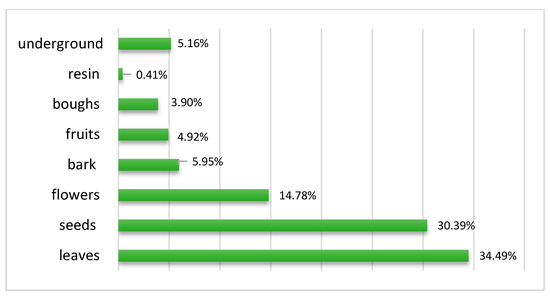 The aerial part (including leaves (34.49%), seeds (30.39%), flowers (14.78%), bark (5.95%), fruits (4.92%), boughs (3.90%) and the resin (0.41%)) is the most used part with 94.98%. Ethnobotanical studies conducted by [8,24,25,26,27,28], also show that the aerial part, especially the leaves, is the part mainly used in the various therapeutic preparations. In the context of conservation, the use of leaves in herbal preparations implies a more sustainable practice. Poffenberger’s studies have shown that removing 50% of the leaves from a tree does not significantly affect its survival [29]. Nevertheless, the collection of these organs is anarchic by local users who tend to pull the whole plant instead of focusing only on the desired part. Therefore this practice can contribute to deforestation and the degradation of ecosystems and natural resources [23]. The high frequency of use of the aerial part, especially leaves, flowers, and leafy branches, can be explained by the ease and speed of the harvest [30] and the fact that they are the site of photosynthesis and sometimes the storage of secondary metabolites responsible for the biological properties of the plant [31]. These organs provide the majority of alkaloids, glycosides, and essential oils [32]. The harvest of the underground part of the plant removes the possibility of the plant obtaining nutrients, which affects its vegetative aspect as well as its physiology [33]. However, while we see a low usage of this part (including the roots, rhizomes, and bulbs) at a percentage rate of 5.02%, it does not entail a risk of the plant’s disappearance. Figure 3 shows the rate of use of all reported plant parts.