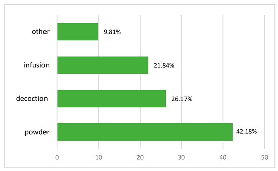 Some plants in their natural form are not suitable to be used directly as a drug and should be subjected to processes like pretreatment, detoxification, and formulation prior to administration. The processing methods include cleaning, cutting, stir-frying, charring, steaming, boiling, burning, etc. The aims of processing are to enhance the efficacy and/or reduce the toxicity and to change the effects or properties of crude drugs [34]. According to the survey, the powder is the most popular preparation method for the plants studied. It represents 42.18%. This result is corroborated by the works of Ghourri M. with a percentage rate of 84.73% [25,35], El Yahyaoui O. with a percentage of 36% [27], and Messaoudi M. with 57% [36]. However, decoction (26.17%) and infusion (21.84%) are modes used just as frequently. These results are different from the work of [23,24,37,38], who reported that decoctions is most commonly used at a rate of 47%, 37.6%; 26.80%; 40.55% respectively. Other preparation techniques (including burning, cooking with food, in the form of oil, direct, maceration, vinegar, juice, and salad) are used less often at a rate of 9.79%. According to Salhi, a decoction can collect the most active ingredients and attenuate or cancel the toxic effect of certain recipes [24]. Benlamdini N. said that decoction warms the body and disinfects the plant to cancel the toxic effect of some recipes, but it can destroy some active ingredients of the species used [23]. After processing, the chemical components of the crude drugs may change dramatically [39]. In addition, medicinal plants have side effects when they are incorrectly ingested by patients. As a result, alternative medicine must be practiced with care and within specific parameters and measurements (Figure 4).