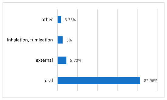 The most frequently used mode of remedy administration is oral ingestion (82.96%). Today, most of the medicines are given orally which is in agreement with some other studies: El Rhaffari L. et al. with 57% [8] and Ouhaddou H. et al., with 64.5% [40]. Nevertheless, several works reveal other important routes. The external route (including several ways of administration: local application, bath, washing) represents 13.7% (Figure 5).