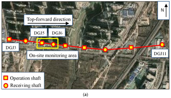 The layout of the working shafts and jacking construction route and vertical arrangement are shown in Figure 1. The jacking construction area from working shafts DGJ5 to DGJ6 is selected for the on-site monitoring and the jacking length is about 100 m. The average thickness of the soil covering the upper pipe is about 6.5 m and the lower pipe is partly buried in hard, moderately weathered rock mass. The pipe-jacking is divided into two stages, which is the lower pipe jacking that first uses the rock pipe jacking machine, and then the upper pipe uses the earth pressure balancing pipe jack.