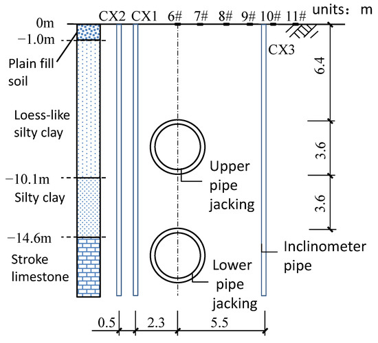 In order to further explore the internal deformation of soil during pipe-jacking construction, the monitoring points of soil horizontal lateral displacement below the surface are arranged at section I on both sides of the power tunnel, numbered CX1–CX3 using inclinometers. The relative position relationship is shown in Figure 2 and Figure 3.