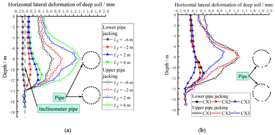 Figure 6a shows the monitoring results of horizontal lateral deformation of CX1 at monitoring section I with different positions of the cutterhead. The distance between this inclinometer monitoring point and the jacking axis is 2.3 m. Figure 6b shows the results of three horizontal soil deformation monitoring points when the jacking distance is 66 m (i.e., L1 = 6 m)
