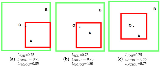 As observed from Figure 2, when A is in the different positions within B, IoU Loss and GIoU Loss remain unchanged. It means that the moving gradient is unable to be obtained and the regression speed decreases. Nevertheless, NGIoU Loss decreases continuously as A approaches B until the center points of A and B overlap, as shown in Figure 2c. According to Figure 1, when the center points of A and B coincide and and A completely overlap, the minimum closed convex shape surrounding A and is . At this time, the penalty term of NGIoU becomes 0, and the NGIoU Loss is equal to GIoU Loss and IoU Loss.
