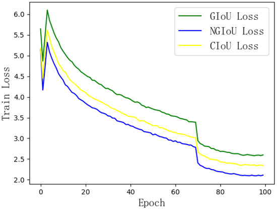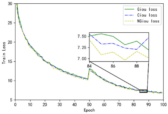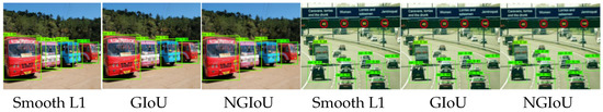 Figure 8 shows object detection results of the predicted boxes trained by using GIoU, CIoU, and NGIoU regression loss functions in the YOLOv5 algorithm. It is observed from the picture that compared with GIoU Loss, NGIou Loss and CIoU Loss are able to predict more objects, even though the overlapping area of the two objects is large. Different from CIoU Loss, the value of the NGIoU prediction box is higher than that of the CIoU prediction box, which proves that the NGIoU Loss has a better performance of prediction.