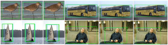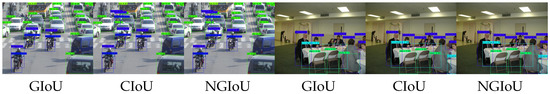 Figure 5 and Figure 6 show the single object detection results and test results trained with GIoU, CIoU, and NGIoU Loss functions from left to right. Blue boxes in Figure 5 refer to true values, and green boxes refer to predicted values. It is observed from Figure 5 that, for different detection objects, the NGIoU Loss proposed in this paper has a higher overlap ratio of target detection and a larger IoU. From Figure 6, it is observed that the vehicle and people will be detected more accurately by using NGIoU Loss function. Relatively speaking, the use of GIoU Losses may lead to missed and false detection. Accordingly, the NGIoU Loss function based on a new bounding box regression accelerates the regression. It makes up for the deficiency that the GIoU Loss function completely degenerates into the IoU Loss function in the case of bounding boxes completely overlapping, so that the loss obtains moving gradients and separates from the platform area.