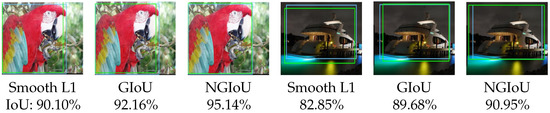 Loss function, for bounding box regression, plays a significant role in object detection. The -norm loss functions are usually used in bounding box regression. They are sensitive to different scales. Early works claim that the L-norm Loss is represented by L1 and L2 losses and assesses the error between the predicted bounding box and the ground truth box by computing the standard deviation or squared deviation between the two. Recent works replace them with IoU-based loss functions. The IoU Loss is the first attempt to include IoU in the regression loss, and it is a success. However, when there is no overlap between the two shapes, the IoU value is 0, so it is hard for the IoU Loss to optimize the regression result. GIoU solves this problem by using closed regions to ensure that the value between two shapes without overlapping regions is not zero, thus greatly improving the reliability of the IoU method. Following GIoU, a number of IoU-based bounding box representations and losses have evolved, including DIoU (which focuses on the distance between two shapes), CIoU (which considers the aspect ratio), PIoU [30] (which is recommended for the rotating target identification) and Updated-IoU [31] (which concentrates on the overlap areas and predicts object localization to obtain the higher position accuracy performance). Therefore, we propose NGIoU Loss by adding a new bounding box, which prevents the NGIoU Loss from completely degrading to IoU Loss.
