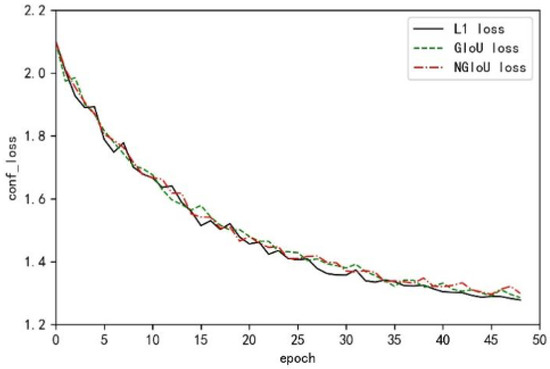 It is observed from Figure 11 that the confidence loss increases by replacing the regression loss function. When using Smooth L1 Loss function, the loss of confidence is the smallest. When using the IoU series regression loss functions, the confidence loss increases with little difference. From the example of vehicle detection in Figure 10, it is clear that the confidence of the vehicle detected by NIoU Loss in Figure 10 (right) is the smallest, and that by the Smooth L1 Loss function is the largest. Meanwhile, Figure 10 (left) shows little difference. It is explained that the smaller the detection object is, the worse the confidence detection effect of NIoU Loss will be. Nevertheless, for large detection objects, it has little influence.
